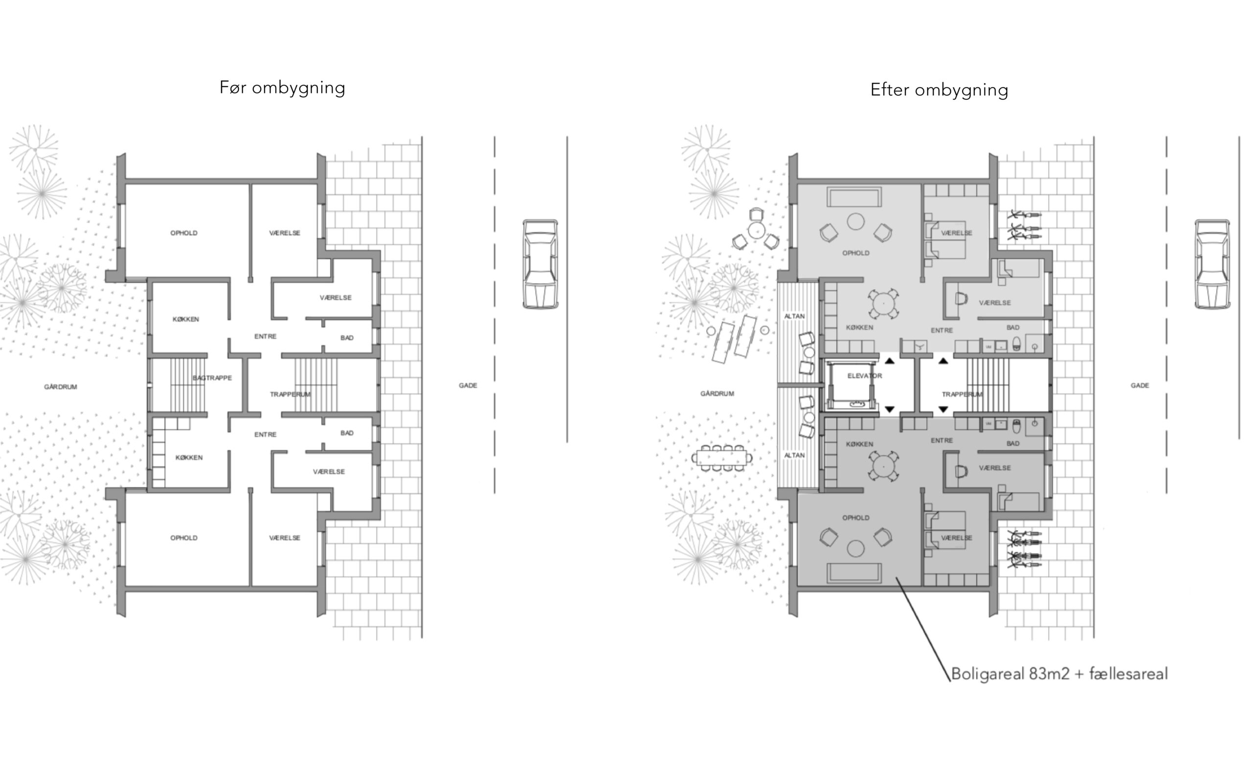 En eksisterende boligejendom opkøbes og ombygges til individuelle seniorboliger med fællesarealer ude og inde. Der etableres elevator i bagtrappeskakt.