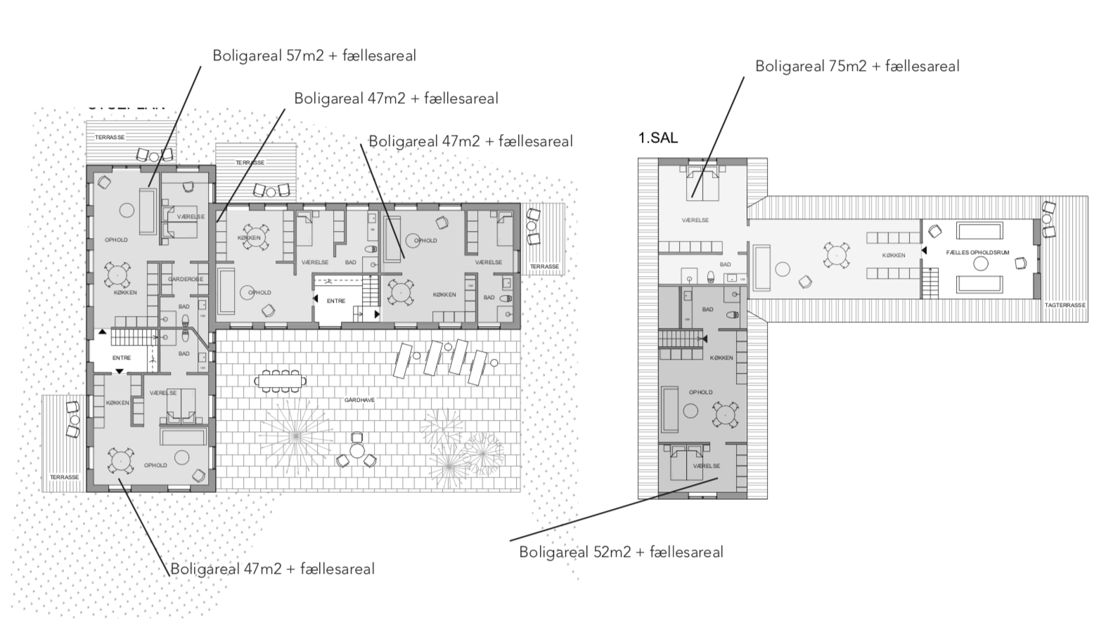 Kvadratmetermål og pris kommer til at variere efter boligernes beliggenhed, men holdes alt andet lige inden for konceptrammerne. Alle tegninger er produceret af arkitekt, Karina Søgaard.